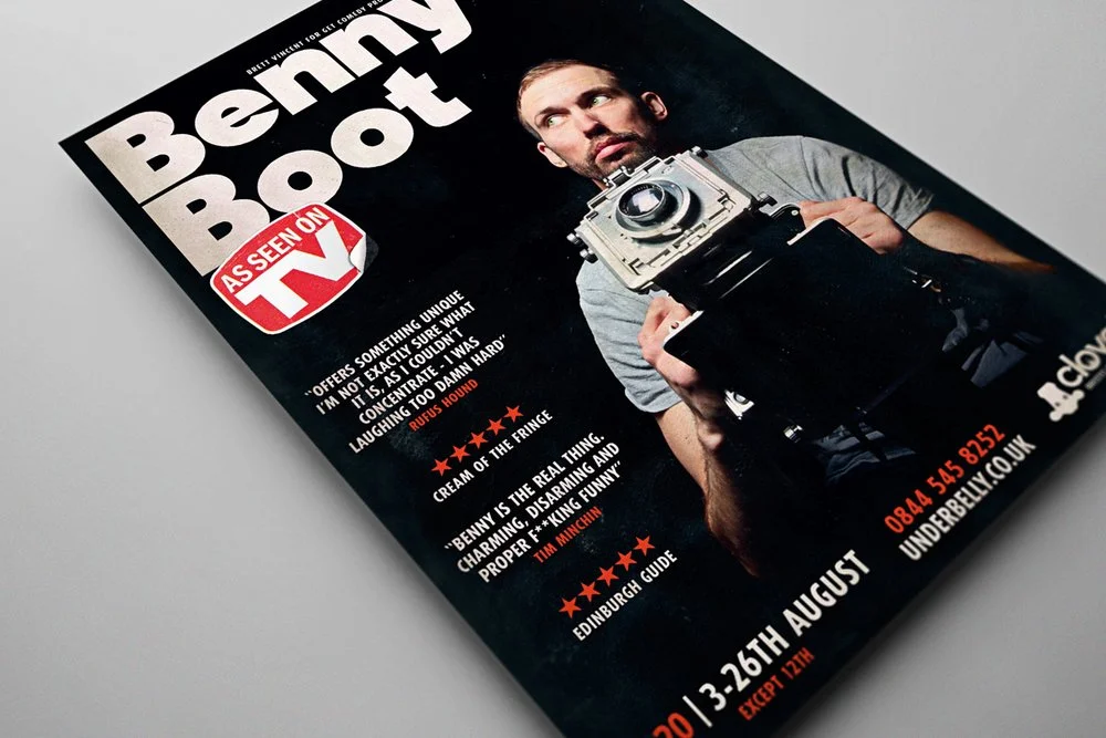 “The conceit, in place from the moment the audience files in to take their seats, is that this is a live recording of the greatly in demand DVD Boot has high hopes commissioning editors will be clambering to buy up and fill our Christmas stockings with. With a cardboard camera documenting our arrival manned by the effects ‘ninjas’, Boot takes the stage as ‘Patrick’ the producer to explain that "black screen special effects" will allow DVD extras to be added as the show is being recorded. And so it begins.” - Fringe Review