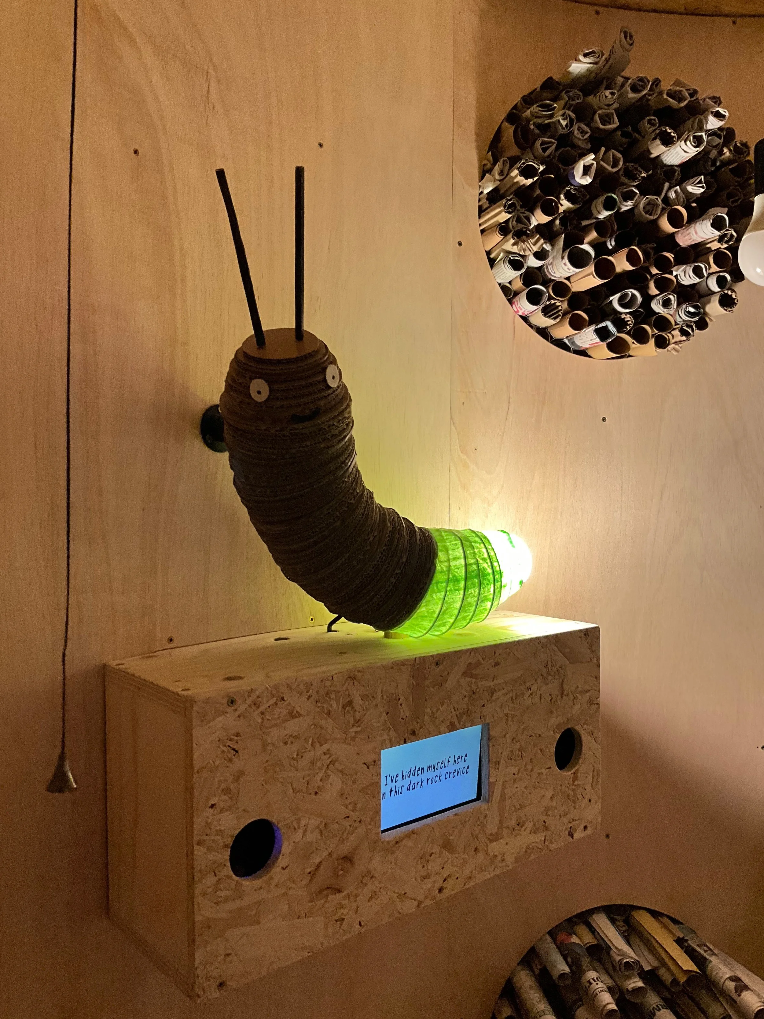 Upon entering the enclosed structure visitors would pull a light cord turning on all the bulbs to light the space and triggering the glowworms story about the difficulties caused by light pollution. When the main lights in the space went off the worm would begin to glow again.