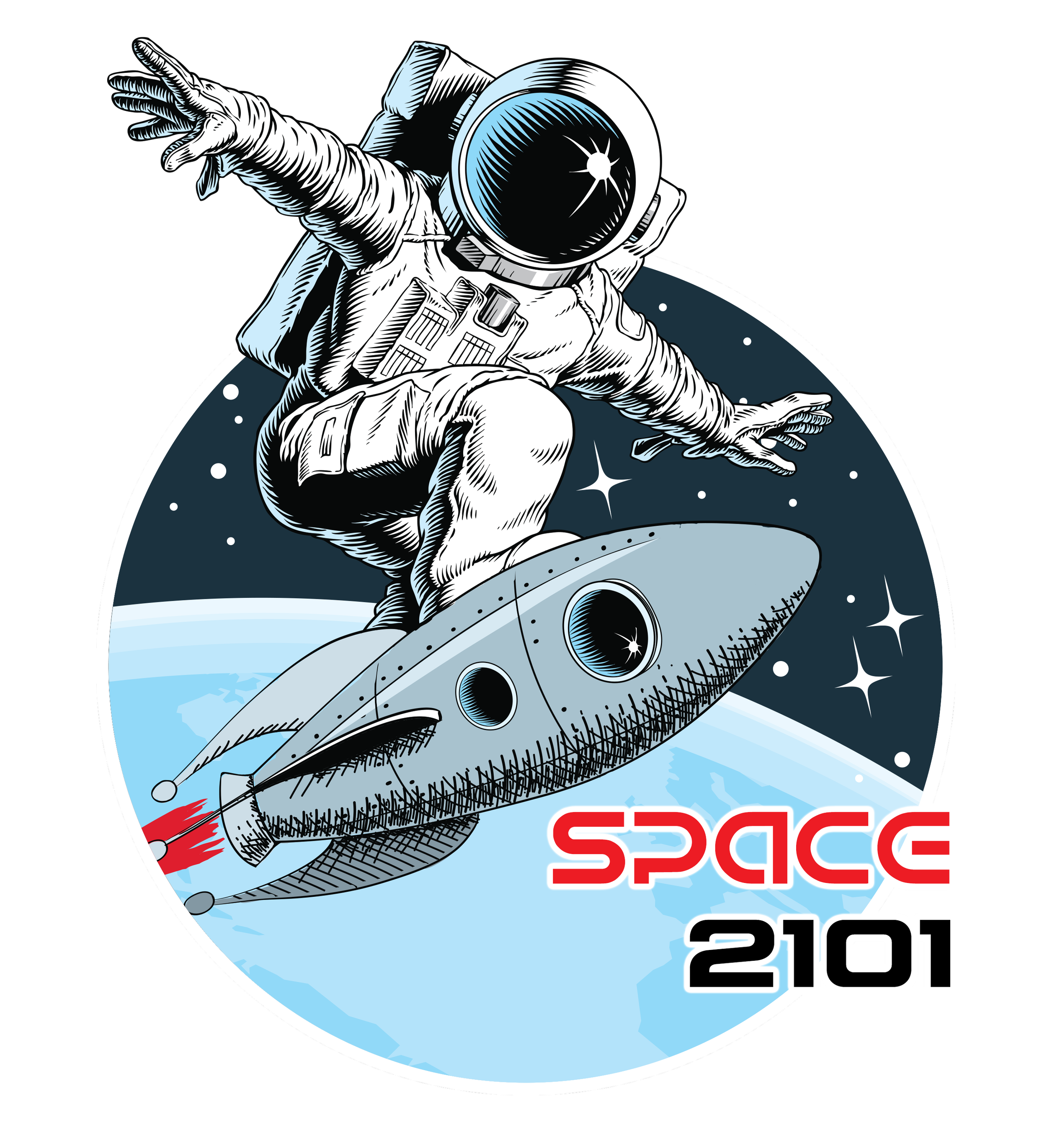 Based on STEM Punks’ ‘Surfing Astronaut’ Logo with the addition of a local connection via the mission patch detail which features the Tees Transporter Bridge; the longest working transporter bridge in the world and a symbol of Teesside's engineering heritage.